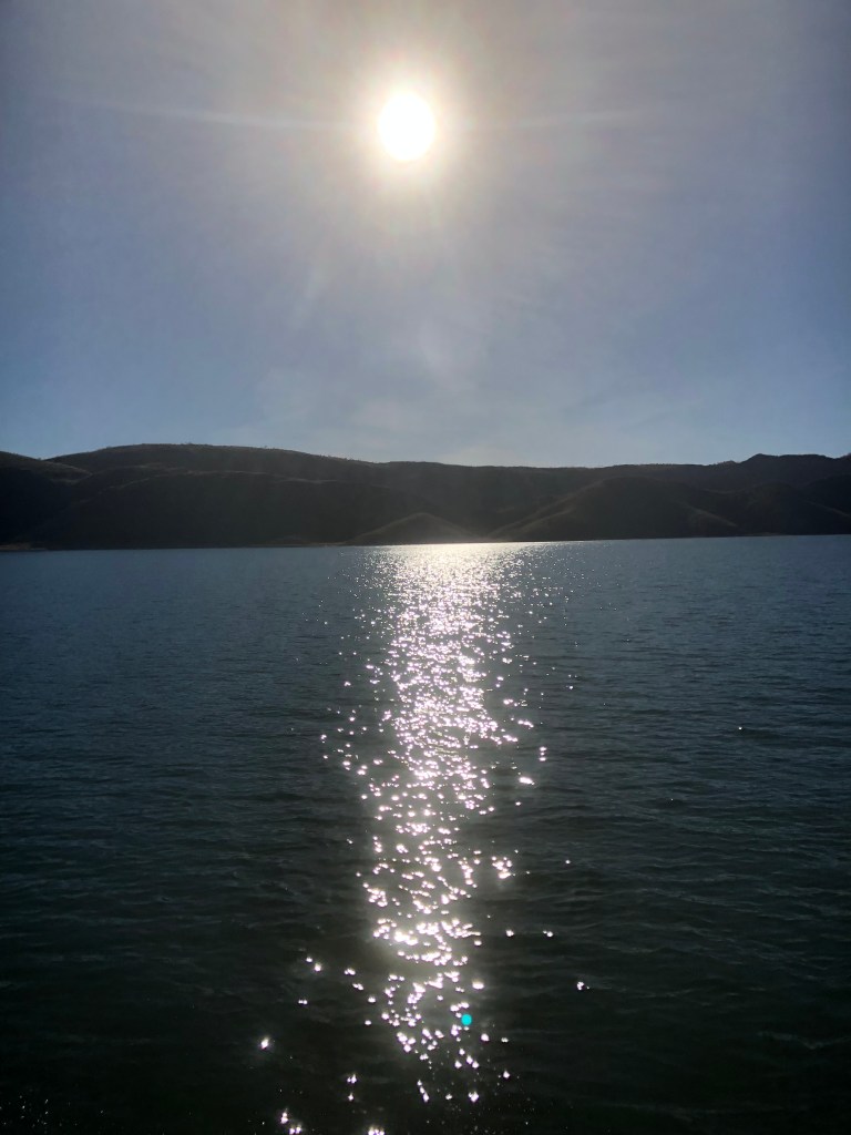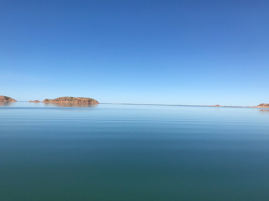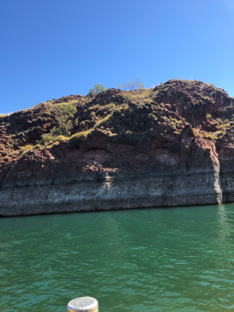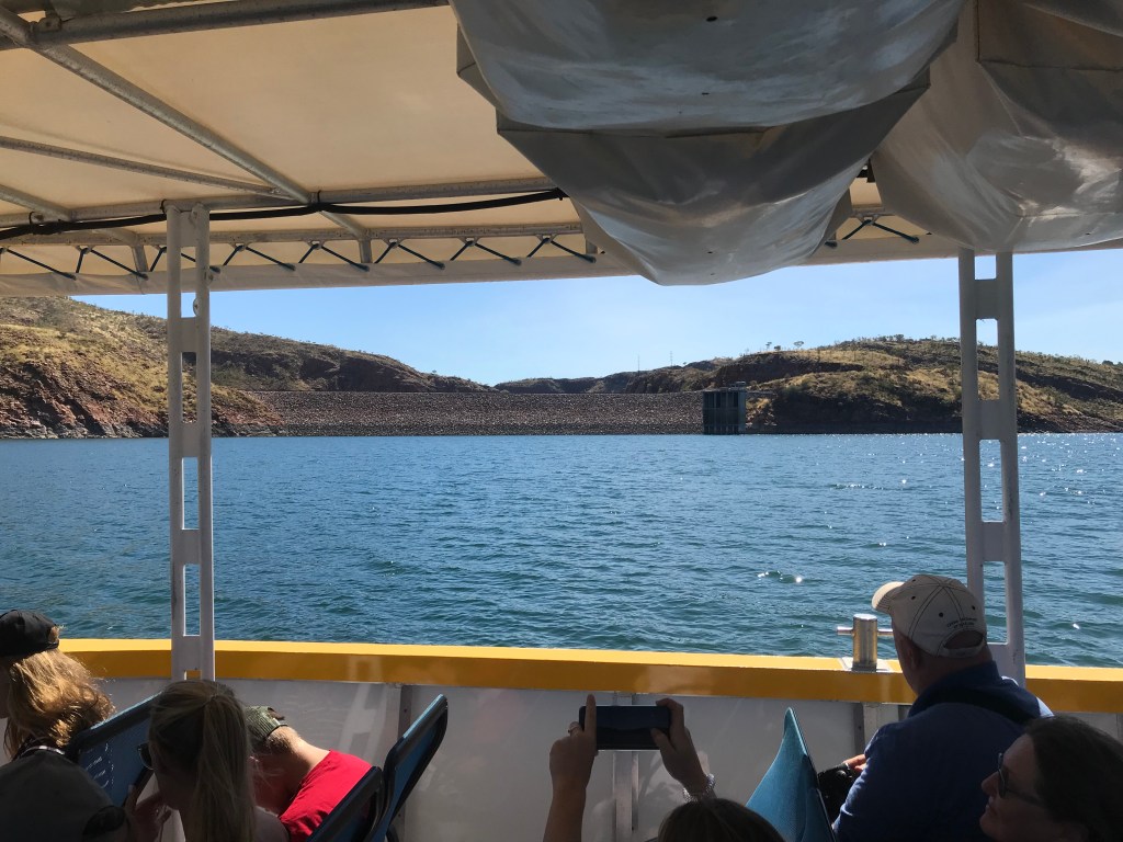 After a half hour visit to the Museum we headed into Lake Argyle Village to change to a larger bus prior to picking up more people at the Caravan Park. We then headed to the jetty area to board our cruise boat. There were about 30 people aboard the boat which had a capacity of about 40 persons so plenty of room to move about. Greg Smith is the owner/operator of the cruise and what he doesn’t know about Lake Argyle isn’t worth knowing, having spent the past 20 years running the cruise. To say the lake is vast would be to sell it short. It is an enormous body of water, 21 times the volume of Sydney Harbour at its peak. Having spent some 30 years living in Perth and hearing the constant need to preserve water and suffering constant sprinkler bans it is hard to see why they don’t build the pipeline that has been mooted since Ernie Bridge first raised the idea back in the late early nineties. They keep saying the cost is prohibitive but 75% of the water in Lake Argyle still goes to waste. Yes, only 25% of the available water is used for irrigation. Sorry I will get back off my soapbox now.