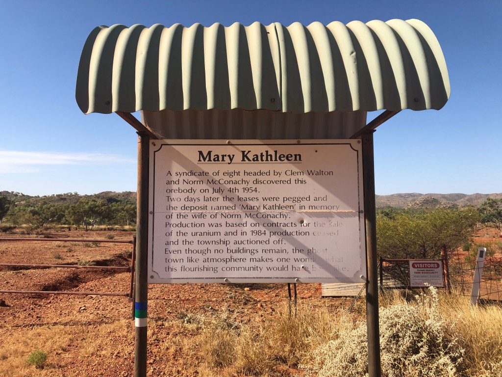 Mary Kathleen Mine, which closed for mining in 1982 is about 60km east of Mt Isa. The actual mine is only accessible by 4wd but you can visit, and stay, at the old townsite. The town which housed about 1,000 people at its peak, was dismantled in 1984 and everything was sold off by auction and all buildings removed. Today all that remains is the paved streets, the base of the town square and the concrete pads where the houses once stood. Well worth having a look at.