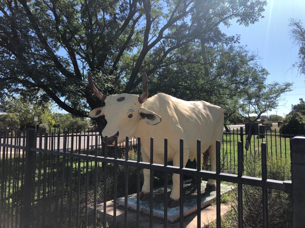 I was headed to Moura next but along the way I came across the town of Banana. I suppose that if New South Wales can have a town named Orange, Queensland is entitled to a town named Banana. There is even a Shire of Banana. Although really only a Roadhouse, a Pub and a Primary School to boast I loved the little park on the hill next to the Memorial Hall and so stayed here for 3 nights. I was on my own aprt from the first night when a caravan pulled in overnight. There is not a single Banana tree in sight but rather the town was named after a much loved bullock. A favourite of local stockmen in the 1860’s, Banana the Bullock , so named for his yellowish colouring, would help herd wild cattle into holding yards. When Banana died, the gully was given the name in honour of his feats.