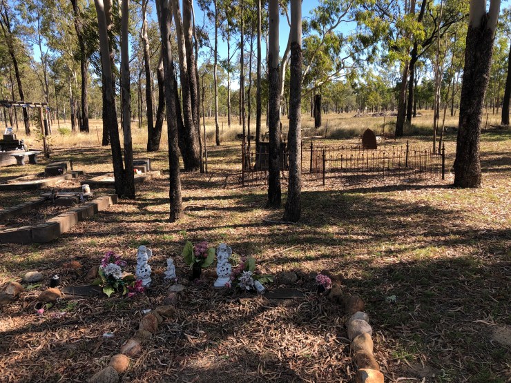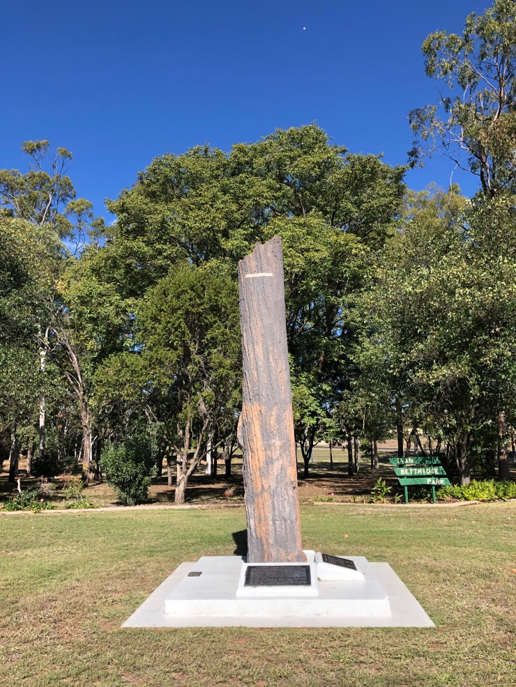 At the top of the main street sits 4 railway carriages which have had murals painted on them. The artist has included a small frog in each of his artworks and the challenge was to find each one. Not easy. The original housing and shops in Clermont were beside the creek and over the years a number of floods occurred. In 1917 a deluge of water created a wave of water and most of these buildings were washed away. An incredible 65 men, women and children lost their lives as their houses were washed away. Whole families lost their lives. A high water marker in the park gives you an idea of how high the water was. After the flood many household items were found stuck high up in threes. As you approach the town you can see a replica piano that has been placed in a tree. 3 such pianos were found in trees after the waters had subsided. The creek area has been named Hoods Lagoon and is a beautiful picnic area with a walkway around the lagoon. After the flood the town was moved higher up the hill. The local cemetery houses the graves and memorial of a number of those that lost their lives in the flood.