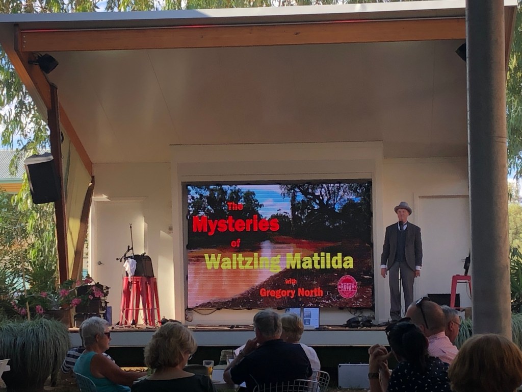 While I was housesitting I got to go into Winton on 3 occasions so I got a bit of a feel for the town before I did my sightseeing. It is a neat tidy town, like most of the small country towns in the outback of Queensland. It is very welcoming to tourists. They know the value that visitors bring to their town and they embrace them. For the population I was surprised to see how many businesses there actually were there. It does of course cater for the man on the land with an abundance of farm supply and related stores servicing a wide area of the region. There are numerous opal shops, opals still being uncovered in the area as well as 4 pubs, 3 of which are in the main street. They all seem to be doing well. I stayed behind the Australian Hotel the night i stayed in town. Meals were a good size and it seemed to cater more for the workers. The Tattersalls Hotel on the corner seemed to be the busiest with excellent meals at lunch time and a popular meeting place for Station owners and workers as well as Grey Nomads with a Caravan Park opposite run by the Hotel. The $16 Rump steak lunch specials were divine. The North Gregory Hotel is the biggest hotel and was surely a grand old lady in her day. She is still an impressive building. This being the fourth time the hotel has been rebuilt following a number of fires in its chequered past. The Hotel has hosted some famous names over the years since first opening in 1879. A bush poet by the name of Gregory North (how ironic) performs for an hour or more each afternoon during the tourist season. He had a repertoire of 3 different theatre shows which he alternates each afternoon. He was very very good, reciting a number of Banjo Paterson’s poems as he told the story of Waltzing Matilda and the different theories on what each stanza is actually about. He worked hard to keep the fairly small crowd engaged but had us all singing Waltzing Matilda. He very much looked the part of Paterson with an uncanny resemblance.