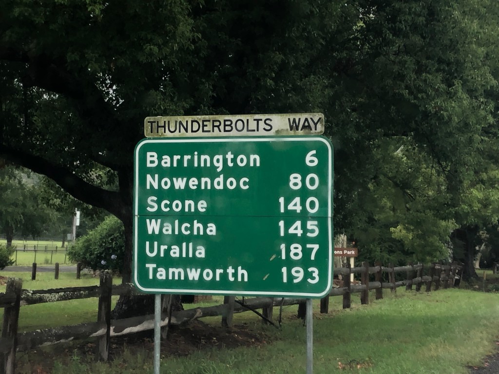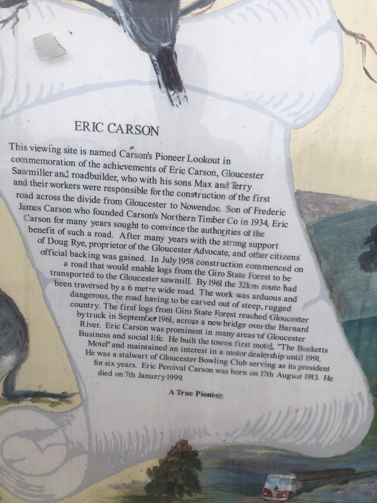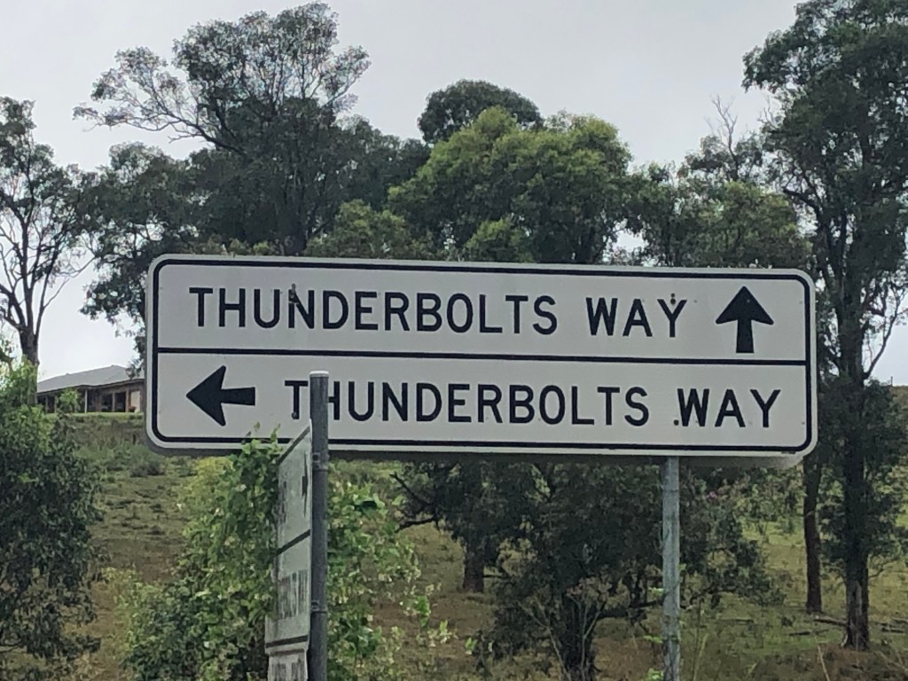 Thunderbolts Way is a 290km road linking Gloucester to 16km south of Inverell at Copes Creek. It is very hilly and winding as it passes across the Great Dividing Range. The road was carved by Eric Carson, a Gloucester sawmiller and road builder to bring out the magnificent hardwood from the forests on the Great Divide. He completed the section from Gloucester to Nowendoc in 1961.