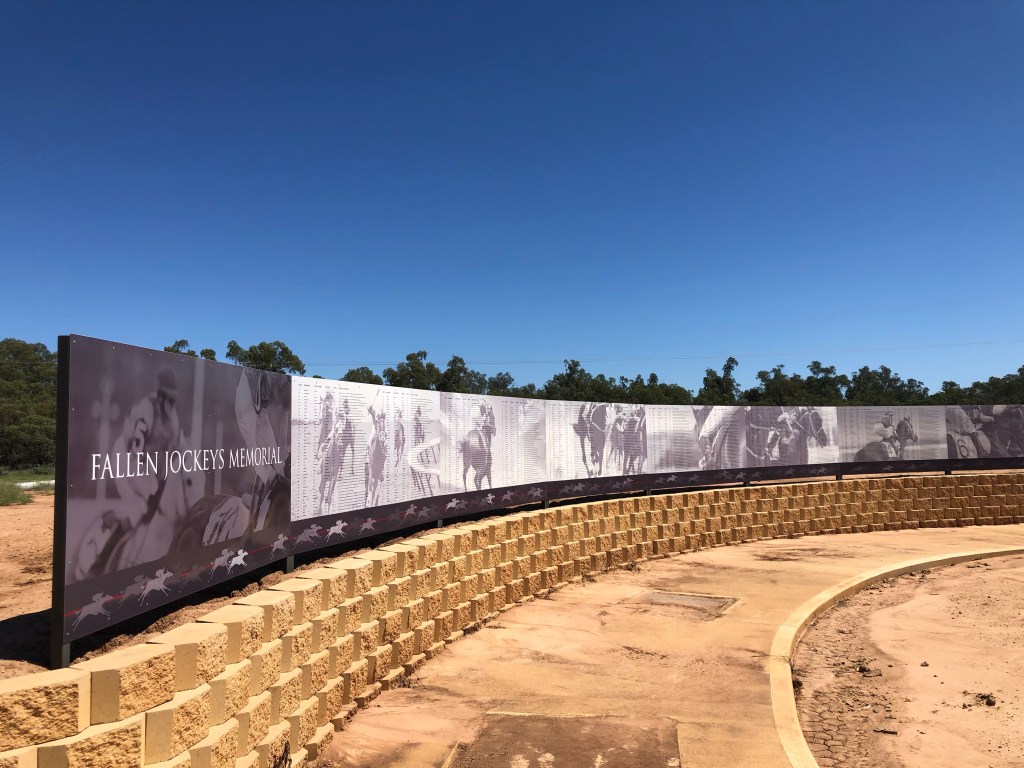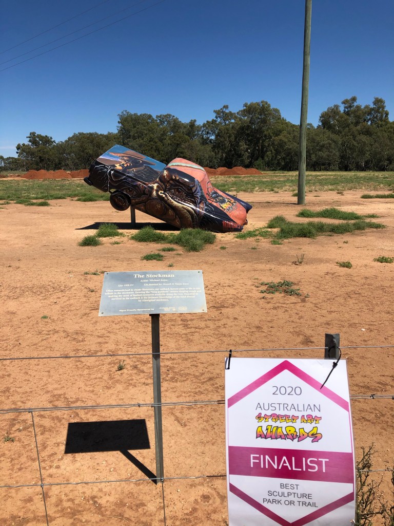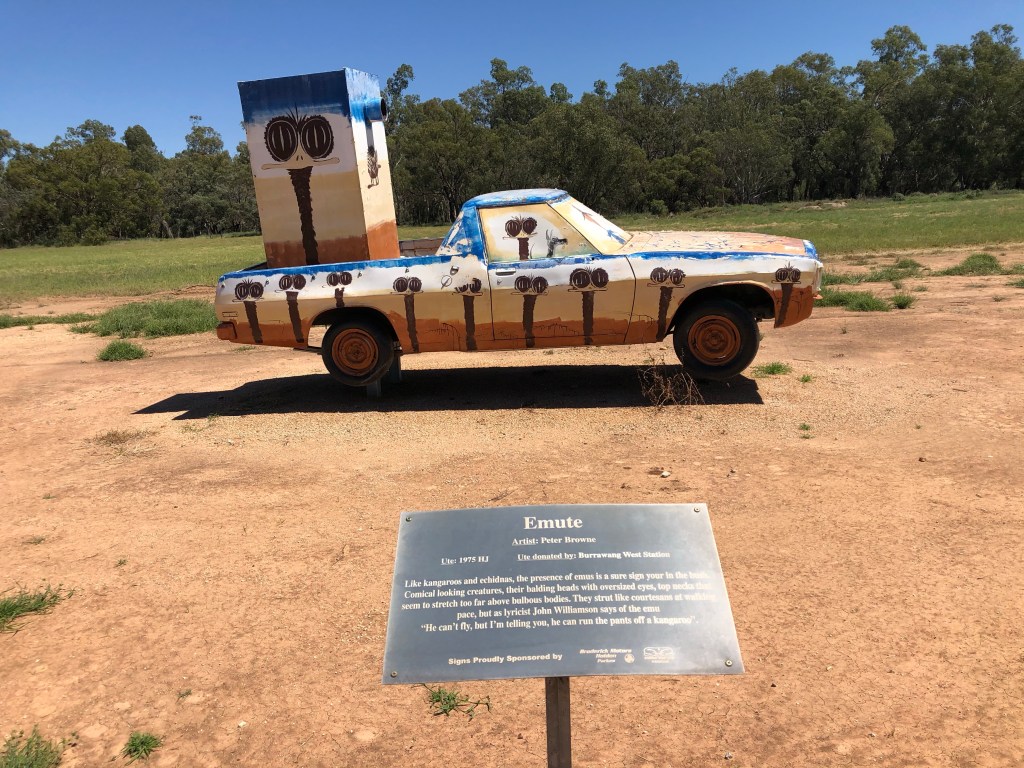 When I picked my 100 for my Bucket List this was Utes in the Paddock at Ootha. I learnt a little while ago that they had moved but I wasn’t sure why. When I visited Condobolin’s Museum I was told that the owners of the property near Ootha where the Utes were situated had sold the property and the new owners were not keen of having the responsibility of housing what was steadily becoming a popular tourist attraction. To its credit the local shire was keen to promote tourism and so purchased the parcel of land opposite the race course in Condobolin to house the displays. The displays had worn a bit over the years and the Shire invited the original artists to “spruce them up”. Some artists repainted theirs while others chose not to so the end result is a mix of colourful and dulled. They are looking to add to the collection. It has so much potential and will improve over time. Adjacent is a memorial wall to jockeys who have been killed in race falls since the 1860’s