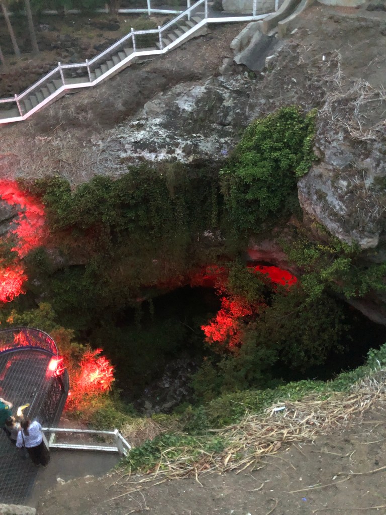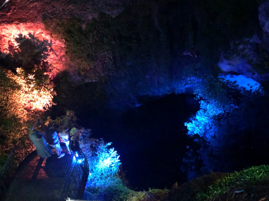 There are a number of sink holes around the town including one smack bang in the middle of town behind the Art Gallery. There is a nightly light show here on dark. A few more lights could have made it spectacular. During rains there is a waterfall that runs into the cave.