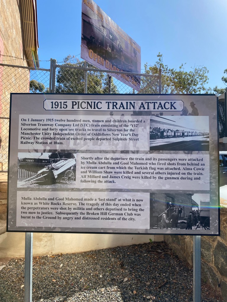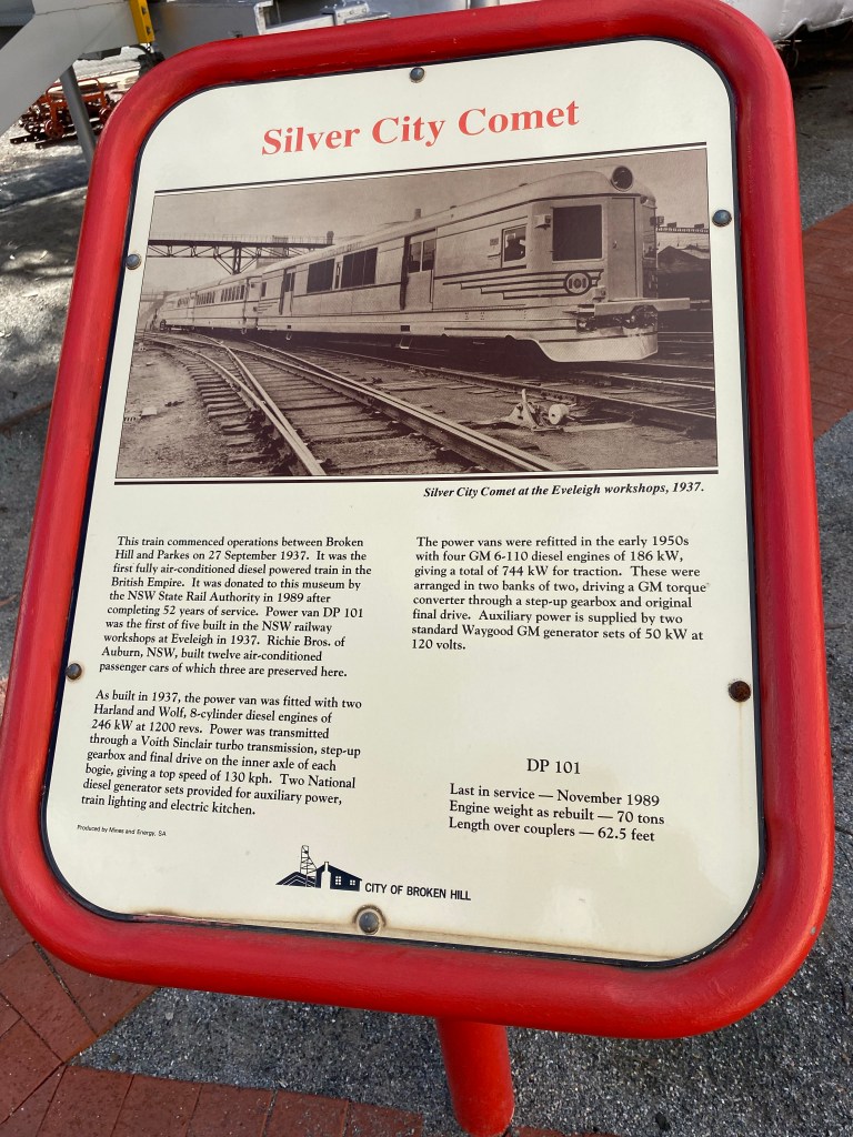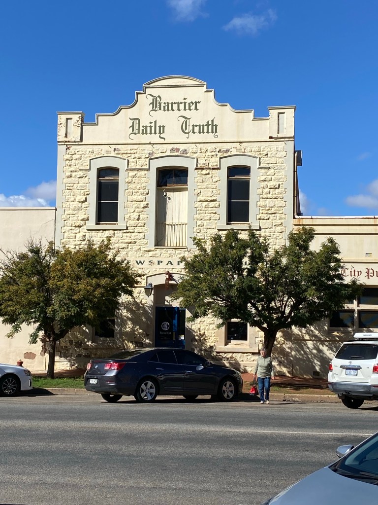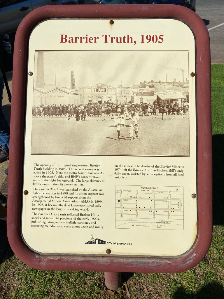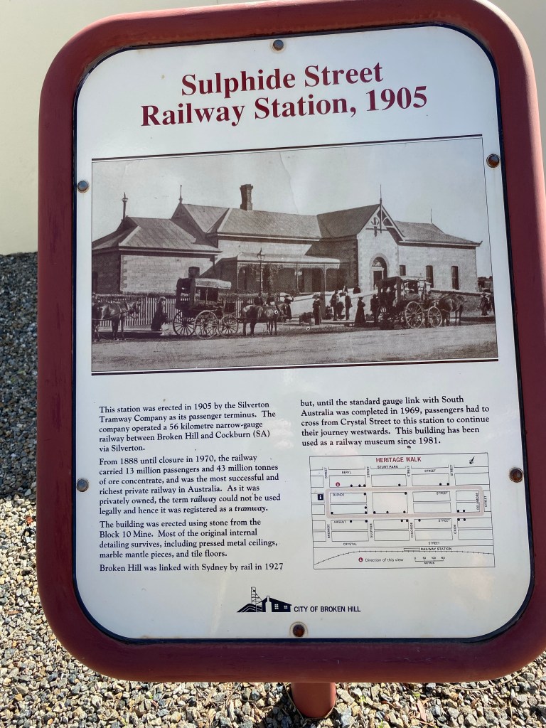 We stopped at a Caravan Park about 3km out of town so walked in one day. We tagged along on one of the Historical tours operated out of the Visitors Centre. It was a 2 1/2 hour walk and talk. It was excellent and well worth the time. They accepted donations afterwards which went to local charities. The next day we caught the town bus from outside the caravan park entrance. It did a loop of both north and south Broken Hill so we did the loop. After we went through town the first time everyone else (only a handful of people used the service) we were the only ones on the bus and the driver gave us a bit of a commentary as we passed different landmarks. The driver also informed us that Actor Chris Hemsworth was spotted in one of the cafes that morning. He was part of the filming we had seen out at Silverton. The bus cost a whole $2.50 each and that was for a whole day!